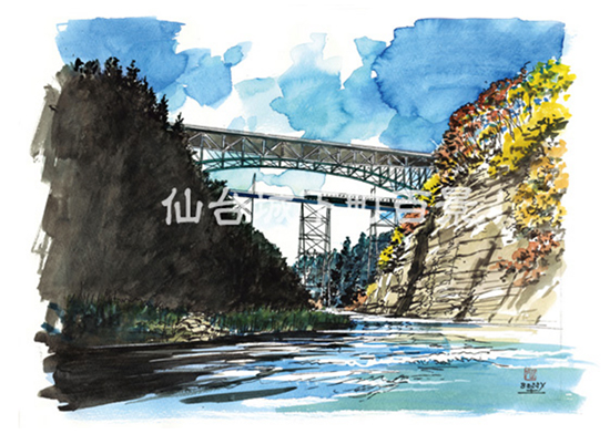仙台市中心部から、山形県の天童へ向かう国道48号線を進んでいくと、ひときわ高い橋が見えてきます。この熊ヶ根橋は、広瀬川の深い峡谷を渡る橋。少し離れた場所を、やはり同じような高さのJR仙山線の熊ヶ根鉄橋が並行して走っていて、鉄路を電車が走り抜けていくところを川原から見ていると、まるで電車が宙に浮かんでいるような風景を楽しめます。